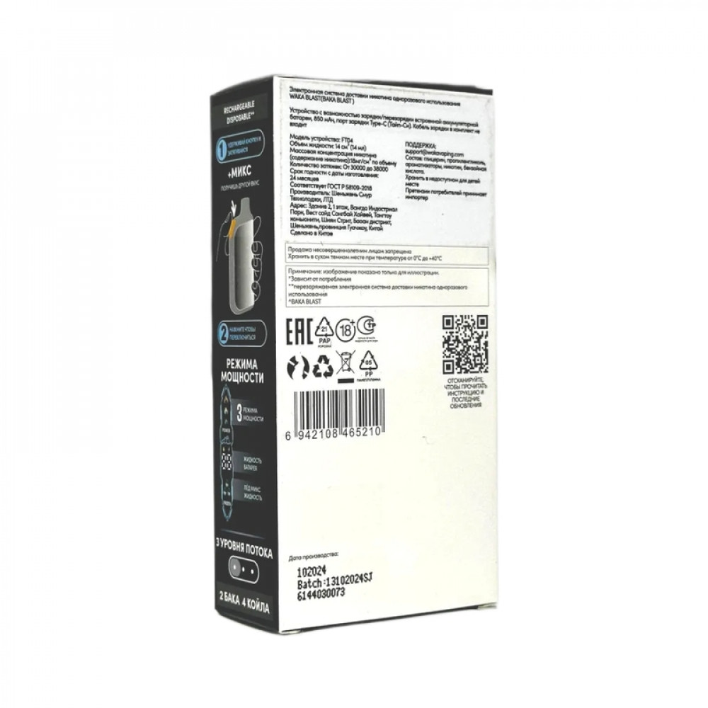 Технические характеристики WAKA BLAST 38000 Hard - Tабак + ваниль микс